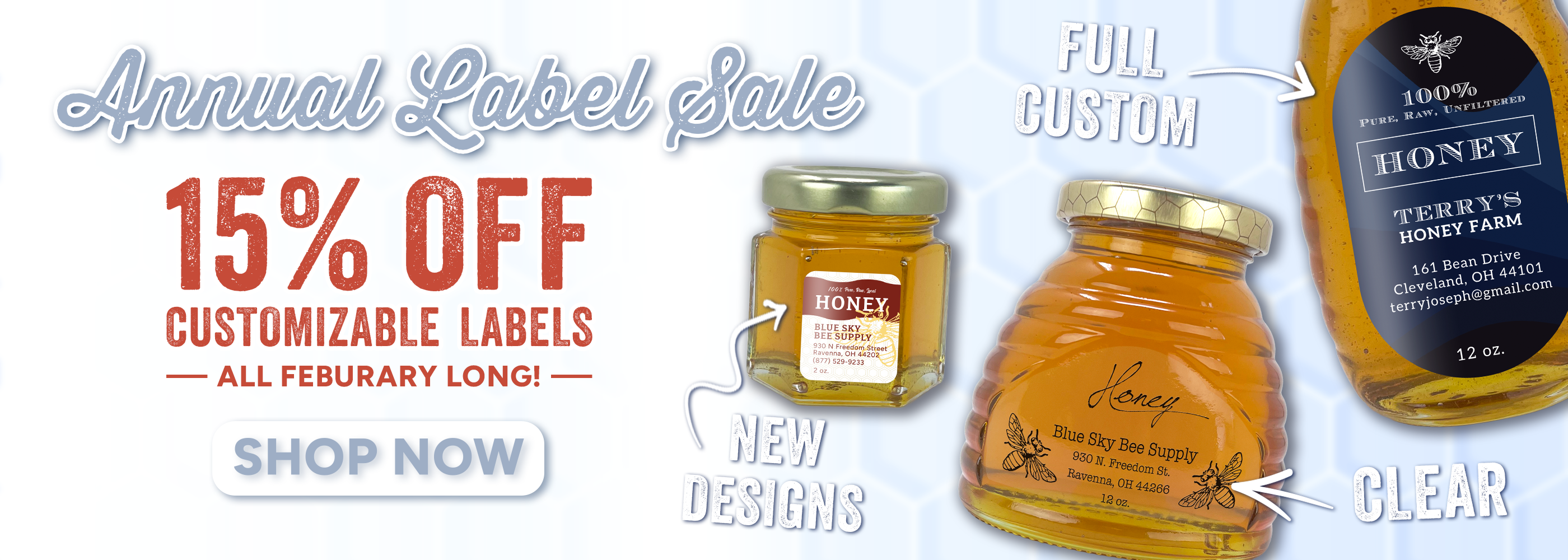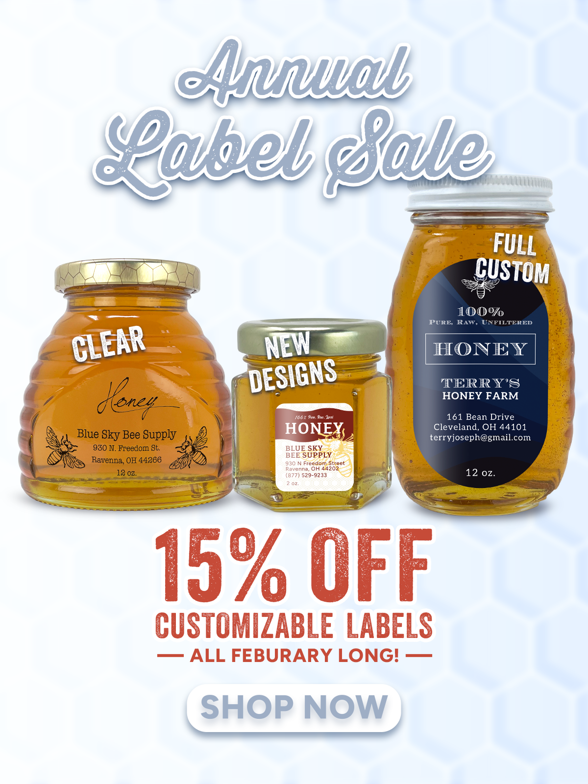 No container is complete without a label. Add your information to one of our customizable Blue Sky designs. Or you can make your own using a full custom design!